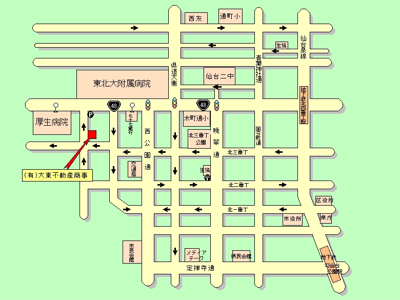 国道48号線を西に進み、東北付属病院前の2つ目の角を左折